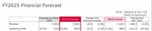 根据伦敦证券交易所集团对17位分析师的调查,在2025财年(从今年4月1日至明年3月31日),电装将全年营收预期从73,500亿日元下调至73,300亿日元;将全年营业利润预期从7,140亿日元下调至6,920亿日元(约合45.3亿美元),低于分析师7,099亿日元的平均预期;将全年营业利润率预期从9.7%下调至9.4%。