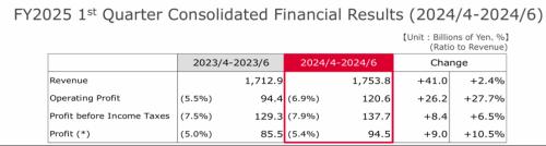 电装表示,在截至6月30日的三个月内,其营收同比上升2.4%至17,538亿日元,其中一半以上的营收来自丰田汽车集团,包括日野汽车和大发汽车;营业利润同比大增27.7%,达1,206亿日元,高于7位分析师1,173亿日元的预期平均值,而去年同期的营业利润为944亿日元;营业利润率为6.9%,高于去年同期的5.5%。