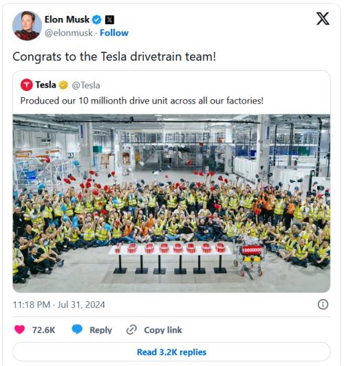 8月1日,特斯拉宣布全球第1000万个电驱系统在特斯拉上海超级工厂下线。特斯拉首席执行官马斯克在X上发文称,“祝贺特斯拉电驱团队!”