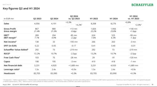总体而言,今年第二季度,舍弗勒集团销售额同比微增3.3%至41.91亿欧元;毛利润为8.8亿欧元,与去年同期的8.67亿欧元基本持平;毛利率同比微降0.4个百分点至21%;不计特殊项目的息税前利润(EBIT before special items)为2.04亿欧元,而去年同期为2.89亿欧元;不计特殊项目的息税前利润率同比下降2.2个百分点至4.9%;归属于股东的净利润同比减少1.05亿欧元至3,300万欧元。