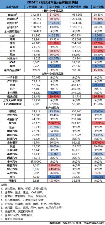 中国品牌整体成绩依旧非常出色,头部几家集团,比亚迪、奇瑞、长安、吉利的销量都在15万辆之上,同比增速喜人。虽然个别车企仅公布了部分数据,但综合1-7月的销量来看,大部分还是稳中向好的趋势。