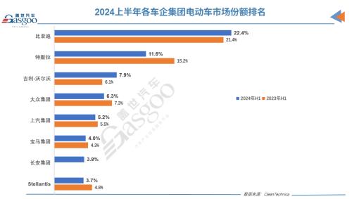 就汽车集团的电动汽车市占率来看,以比亚迪为首的中国汽车制造商的市场份额不断攀升,例如比亚迪的市占率同比上升1个百分点,吉利-沃尔沃的市占率提升1.8个百分点;相比之下,以特斯拉为首的外国车企的市占率则不断下降,其中以特斯拉为甚,一年下来市场份额跌了3.6个百分点,另外大众集团、宝马集团和Stellantis的市场份额也分别减少1个、0.3个和1.1个百分点。