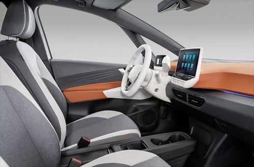 ID.3的全液晶仪表盘的设计比较简洁,同时电子挡把位于右侧,与仪表盘连为一体,通过转动端部即可实现换挡,非常酷炫。同时,用户在仪表盘右侧也可看到当前挡位。功能上,HUD抬头显示、语音识别、全液晶仪表盘、整车OTA升级等在新车上均有配备。