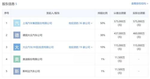 根据股权信息显示,上汽大众汽车有限公司目前拥有5大股东,其中上海汽车集团股份有限公司股权占比达50%,其次为德国大众汽车公司股权占比为38%,大众汽车(中国)投资有限公司占10%,而奥迪股份有限公司和斯柯达汽车公司分别占比为1%。