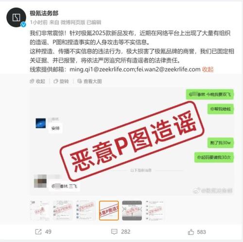 日前,极氪法务部官方微博发文称,针对极氪2025款新品发布,近期在网络平台上出现了大量有组织的造谣、P图和捏造事实的人身攻击等不实信息。公司已固定相关证据、并已报警,将依法严厉追究所有造谣者的法律责任。
