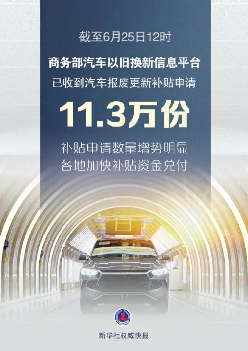 商务部数据显示,汽车以旧换新信息平台从收到全国第一份汽车报废更新补贴申请,到申请量突破1万份,用了25天;从第1万份到第2万份申请,用了7天;到第3万份申请,仅用了4天......截至6月25日,以旧换新信息平台收到汽车报废更新补贴申请11.3万份。