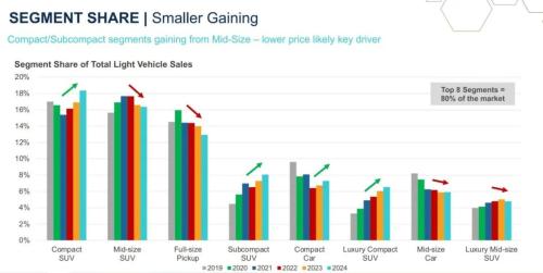 这让人联想到同为年销千万辆级、更为成熟的美国市场。紧凑轿车大约占美国车市7%出头份额,而中型轿车则占据6%,差距较小。