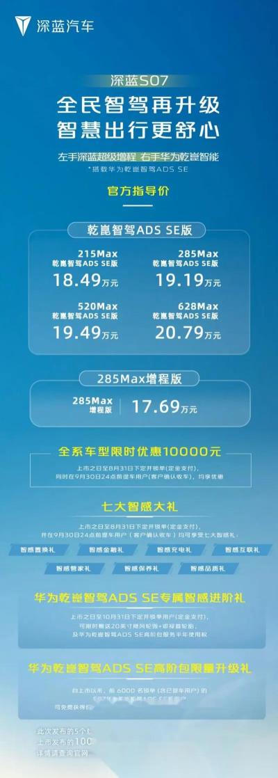 日前,深蓝汽车正式宣布新车S07部分车型售价下调。其中,深蓝S07乾崑智驾版车型根据配置不同分别降价5000元和8000元。此外,285公里续航版本相比215公里版本价格差从1万元调整至0.7万元。