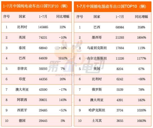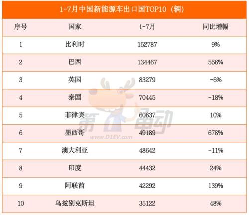 比利时是中国新能源车最大的出口国,1-7月比利时中国新能源车销量15万辆,同比增长9%。紧随其后的是巴西和英国。
