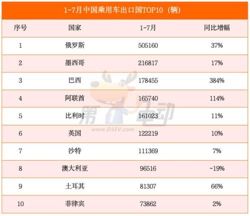 紧随俄罗斯其后的是墨西哥,出口量达到22万辆,同比增长17%。中国乘用车出口到巴西的销量同比暴涨384%,取代比利时,位居出口榜第三;阿联酋出口量同比暴涨114%,从去年同期第九跃居至第四。