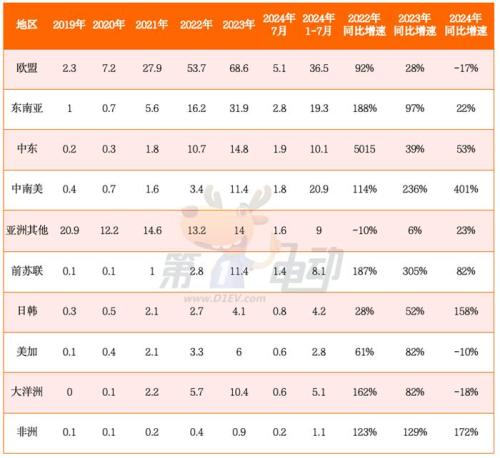 除了中国乘用车在欧盟出口量下滑,美国、澳大利亚的出口均萎缩。而非洲、日韩、中南美今年出口量实现翻倍暴涨,前苏联、中东出口量同比大涨超50%。