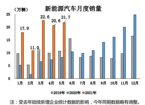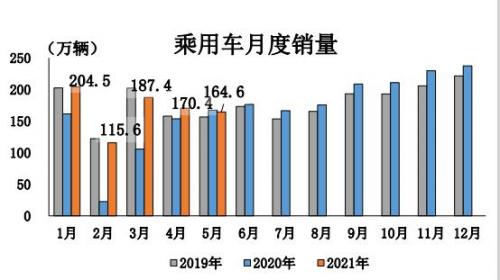 1-5月,乘用车累计产销分别完成828.5万辆和843.7万辆,同比分别增长39.1%和38.1%,增幅比1-4月继续回落16.2和15个百分点。与2019年同期相比,产量同比分别下降1.4%,销量同比增长0.3%,其中产量降幅比1-4月继续收窄2个百分点,销量增速已实现由负转正。