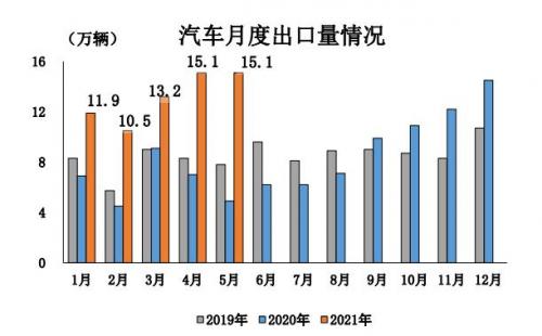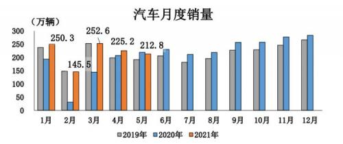 2021年1-5月,汽车产销分别完成1062.6万辆和1087.5万辆,同比分别增长36.4%和36.6%,增幅比1-4月继续回落17和15.2个百分点。与2019年同期相比,产销同比分别增长3.6%和5.8%,增幅比1-4月扩大1.5和1.3个百分点。