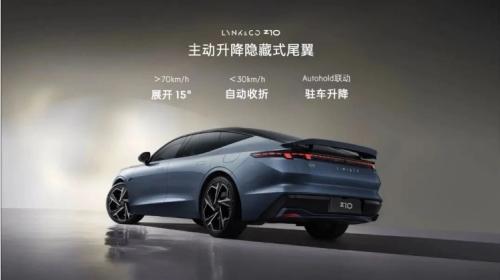 这次的Z10,领克着重突出了两个标签:豪华和运动。领克Z10采用The Next Day概念车的家族式前脸设计,基于空气张力学理念,还设计了主动升降隐藏式尾翼,车速超过70km/h时自动展开,车速小于30km/h时自动收起,加上全车多处风阻优化设计,实现了0.198Cd的风阻系数。