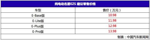 该车是名爵ZS的纯电动版本,名爵EZS搭载的永磁同步电机最大功率可达110kW(150PS),峰值扭矩350N·m,0-50km加速仅为2.8s。此外,购买纯电动名爵EZS还可享受8年或15万公里的三电质保、8年或20万公里电池衰减<30%、互联网车型基础流量和基础服务终身免费、1年零利率等多重礼遇。