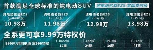 中国汽车新闻网讯3月30日,纯电动名爵EZS将式上市,首批上市共4款车型。前一万名购车用户可享1万元限时立减补贴,实际补贴后全国统一零售价10.98万元-13.98万元,MG名爵还特别推出特权购车方案,9.99万买欧洲纯电SUV,999元/月租电池,享999特权。