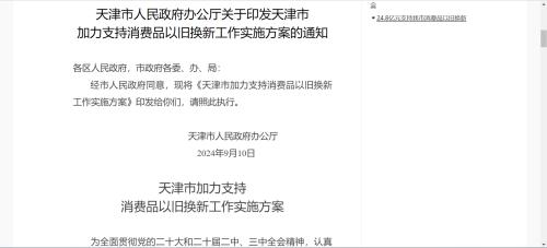 9月11日消息,天津市人民政府办公厅于近日印发《天津市加力支持消费品以旧换新工作实施方案》(以下简称“《方案》”),提出将以24.8亿元规模资金支持8个具体方向的以旧换新消费。