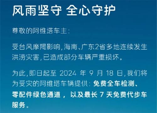 而在台风“摩羯”来临时,我们看到不少车企都展现出了担当精神,并提供了多项服务支持。比如北汽极狐为受台风影响的用户提供免费道路救援等服务,阿维塔提供免费全车检测、零配件绿色通道以及最长7天免费代步车服务。