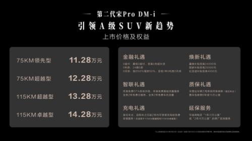 9月23日,比亚迪第二代宋Pro DM-i焕新上市,新车共推出4款车型,官方指导价11.28万元-14.28万元。新车搭载比亚迪第五代DM技术,百公里亏电油耗低至3.79L,创A级SUV新低,满油满电综合续航超1400km,是主流务实家庭、年轻单身用户的购车首选。