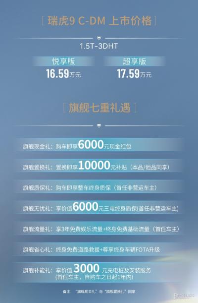 目前购瑞虎9 CDM有七重礼遇:购车即享6000元现金红包、置换享10000元补贴(本品/他品同享)、购车即享整车终身质保(首任非营运车主)、享价值6000元三电终身质保(首任非营运车主)、享3年免费娱乐流量+终身免费基础流量(首任车主)、终身免费道路救援+尊享终身车辆FOTA升级、享价值3000元充电桩及安装服务(首任车主,自购车之日起1年内)。