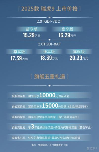 目前购2025款瑞虎9有五重礼遇:即享10000元现金红包、置换享至高15000元补贴(本品/他品同享)、即享整车终身质保(首任非营运车主)、享3年免费娱乐流量+终身免费基础流量(首任车主)、终身免费道路救援+尊享终身车辆FOTA升级。