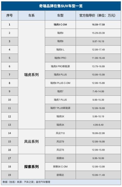 据盖世汽车统计,目前奇瑞品牌在售SUV车型主要包含瑞虎、风云与探索三大系列,共计19款车型,密密麻麻的分布在4.99~22.99万的价格区间里。