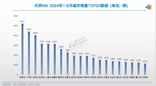 问界M9的销量也主要是深圳和广州贡献,两大城市前8月合计上险量接近万辆。其中,深圳是唯一销量突破5000辆的城市。随后的广州、北京均贡献了4000辆。问界M9的城市销量集中度同样较高,前20名城市累计销量为4.6万辆,占总量的52%。