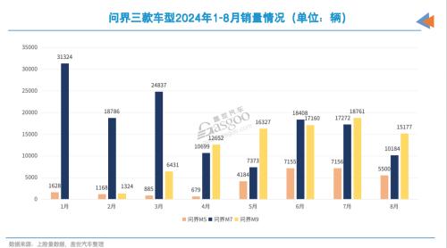 自今年初第三款车型M9开启规模交付以来,问界系列销量呈现稳步上升态势。今年前8月,问界系列累计销量达25.4万辆,是去年全年销量(9.4万辆)的近三倍。然而,细看月度数据,问界的销量曲线波动较大。