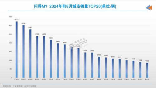 这两座城市是问界M7前8月上险量唯二突破6000辆的城市。其中,广州销量高达6472辆,排在第一。另值得注意的是,问界新M7的销量分布相对集中,前20名城市贡献了7万辆的上线量,占品牌比重的五成。
