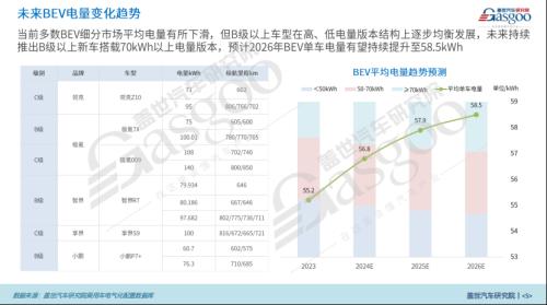 值得注意的是,B级以上车型在高、低电量版本结构上逐步走向均衡发展,这意味着无论是追求高续航还是经济实用的消费者,都能在B级以上车型中找到符合个人需求的选项。未来,市场将持续推出B级以上新车搭载70kWh以上电量版本。预计到2026年,BEV单车的平均电量有望得到持续提升,达到58.5kWh左右。