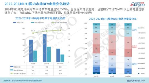 对电量变化来说,在2024年上半年,纯电动乘用车领域的平均单车电量已提升至56.7kWh,呈现出逐年递增的态势。值得注意的是,配备70kWh及以上大容量电池的车型正迅速扩大其市场版图,今年上半年已达到27%的份额,这一趋势反应出消费者对具备更长续航能力车型的偏好日益增强。与此同时,50kWh以下低电量车型的市场份额则经历了缩减,整个市场呈现出鲜明的K型分化趋势。