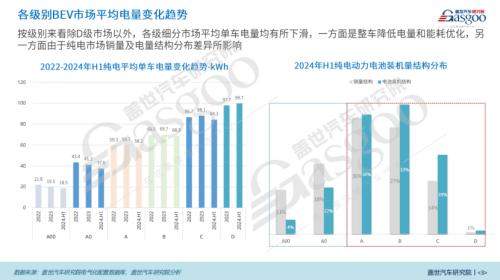 按级别来看,除D级市场以外,各级细分市场平均单车电量均有所下滑。一方面是整车降低电量和能耗优化,采用更高效的电池管理系统、提升电机效率以及优化车身设计等,在不牺牲性能的前提下,降低单车所需电量,从而提升车辆的能源效率和续航能力。另一方面由纯电市场销量及电量结构分布差异影响,A、B、C级车型因更注重性价比和实用性,其市场销量增长伴随着更经济、电量更低的车型比例上升,导致平均单车电量下滑。而D级车型则因消费者对高性能和超长续航的偏好,平均电量微增。