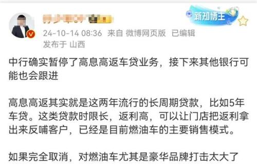随着汽车金融行业群关于四大银行停止高息高返(又称高融高贷)车贷业务的消息开始广泛流传,类似于车险0返佣规定的改革,终于靴子落地了。