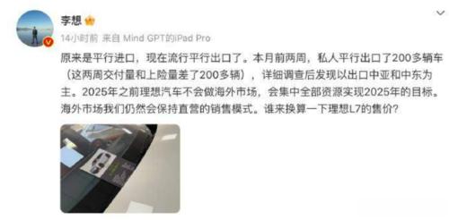 近期,有媒体报道称,接近理想的人士对其表示,二季度开始,理想海外销售转向以平行出口为主,“一些大型贸易商会从理想采购新车向中亚市场输送。”该人士表示。