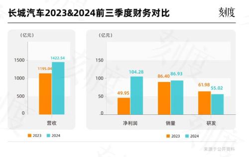 具体来看,前三季度长城汽车总营收为1422.54亿元,同比增长19.04%,净利润104.28亿元,同比增长了108.78%。