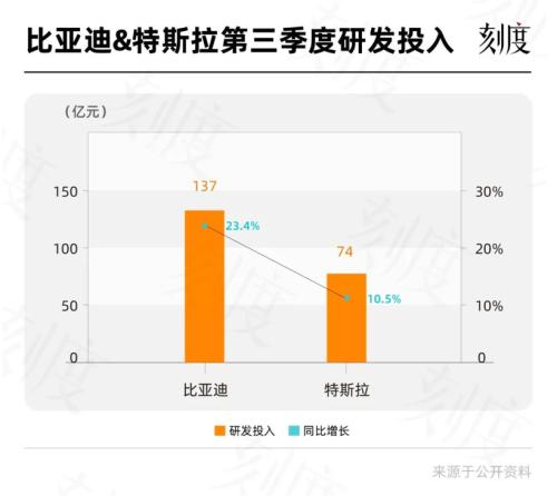 近些年,比亚迪在研发方面肉眼可见的重视了起来,第三季度,比亚迪在研发上投入了137亿元,同比增长了23.4%,而特斯拉第三季度的研发费用却下降了10.5%,只有74亿元。