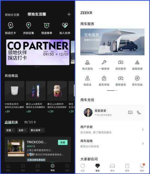 除了常见的“社区、商城、爱车和个人中心”外,极氪为“用车服务”单独设立了一个入口,而领克则把这个位置留给了特色周边——“领地”。