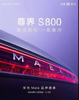 近日,鸿蒙智行官方发布了旗下尊界首款车型预告图,新车定名为尊界S800,并计划在11月26日举办的华为Mate品牌盛典上正式发布。此外,新车将于2025年春季之前上市,而尊界的第二款车型则将会在2025年底推出。