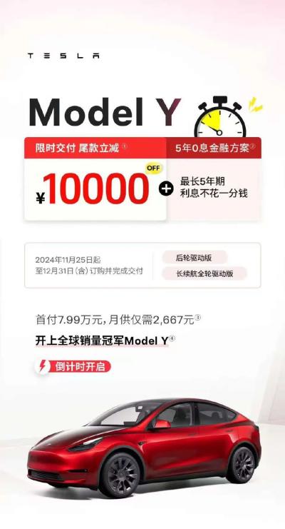 北京时间11月25日一早,随着特斯拉在华官宣,针对旗下Model Y的后轮驱动版车型和长续航全轮驱动版车型,推出了购车并完成交付尾款立减10000元,还可叠加享受“5年0息”的促销活动。