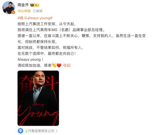 12月9日,盖世汽车获悉,上汽乘用车正式任命周担任MG品牌事业部总经理一职,且其本人也在微博官宣确认。