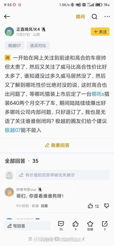 11月27日,有网友在网上提问:一开始关注到前途和高合,然后又关注了威马,然后又了解到哪吒,等哪吒猎装上市后定了一台哪吒s猎装640两个月交不了车。极越的圈友们给个建议极越07能不能入?