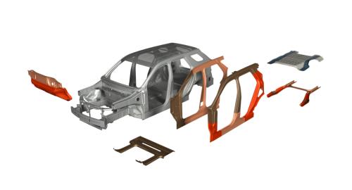 具体来看,通过使用热成形钢(PHS)和热成形激光拼焊技术,多零件集成旨在将多个零部件整合到一个激光焊接板(LWB)中,只需一套模具一次冲压即可成型来制造单个大型零件,有效简化生产流程,提升了整车车间的生产效率,同时助力主机厂实现碳排放的减少和碳足迹的优化。