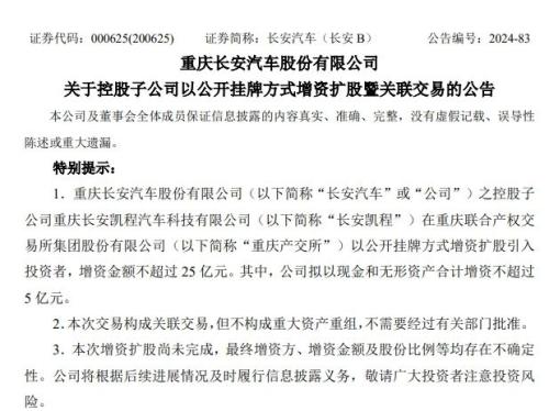 根据公告中显示,长安凯程将在重庆联合产权交易所通过公开挂牌方式增资扩股,引入不超过25亿元的资金。长安汽车计划以现金和无形资产相结合的方式,对长安凯程增资不超过5亿元。
