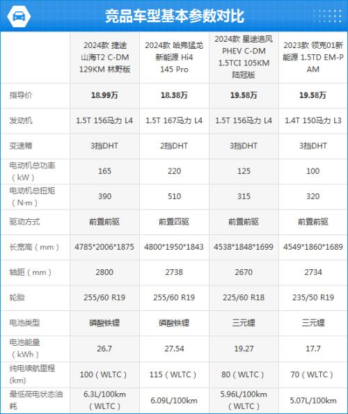 与同属于插混紧凑型SUV的哈弗猛龙新能源、星途追风PHEV和领克01新能源进行对比,2024款捷途山海T2在配置方面占有优势。如内置行车记录仪、自动变道辅助、面部识别、方向盘加热以及主动式环境氛围灯等均为独享配置。此外,2024款捷途山海T2的价格适中,可见在同级别车型中其性价比表现较为出色。