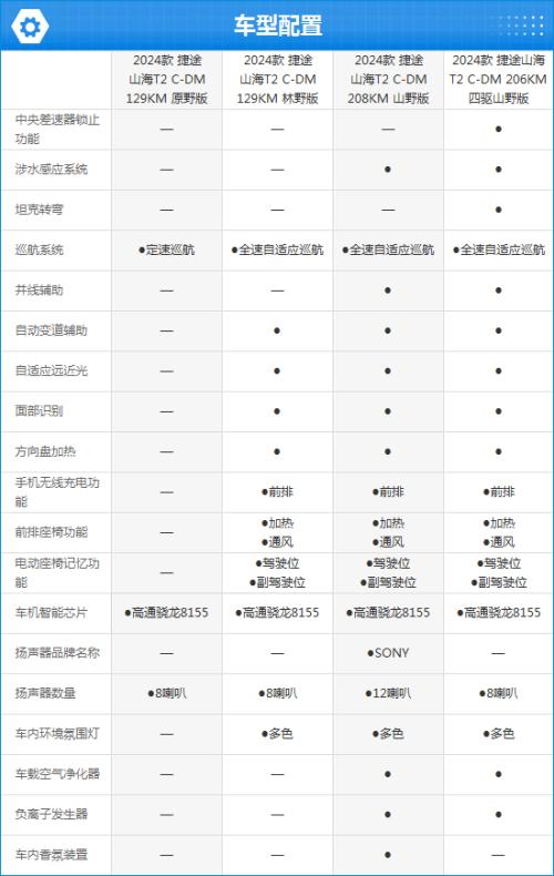 通过配置对比发现,2024款捷途山海T2提供两驱和四驱两种驱动形式以及多种续航版本,能够满足不同消费者所需。同时,入门版车型的功能缺失明显,而从次低配开始,配置表现开始符合主流水平。反观顶配版本,其更注重动力表现和四驱系统,配置方面反而不如次顶配丰富。