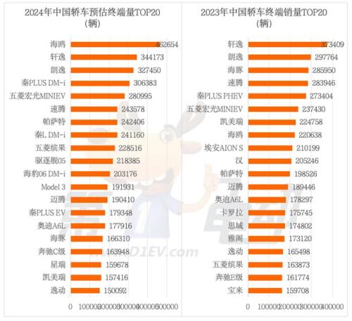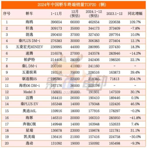 每年12月,各大车企通常会加大销售力度,总量一般相比11月提升20%左右。基于此,我们以11月终端销量数据乘以1.2的系数来预测12月的终端销量,估算出2024年中国轿车TOP20的终端销量。