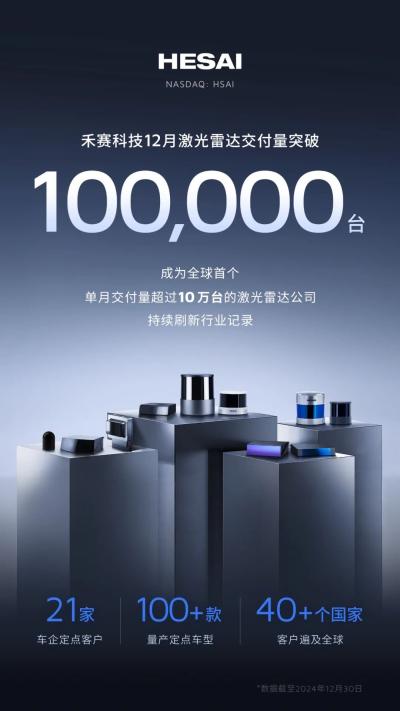 2024年,对于禾赛科技来说,无疑也是收获的一年。12月30日,禾赛科技宣布,2024年12月激光雷达交付量超10万台,成为全球首个达成单月交付量超过10万台的激光雷达企业。