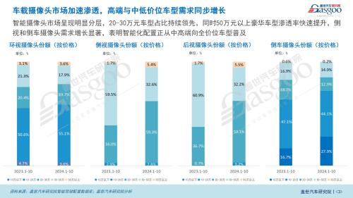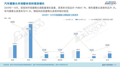 相比之下,侧视和后视摄像头的渗透率较低。侧视摄像头主要用于盲点监测和变道辅助,后视摄像头主要用于倒车辅助。2024年1-10月,侧视摄像头的搭载量为397.2万颗,渗透率为11.2%,而后视摄像头的搭载量为194.8万颗,渗透率为10.9%。