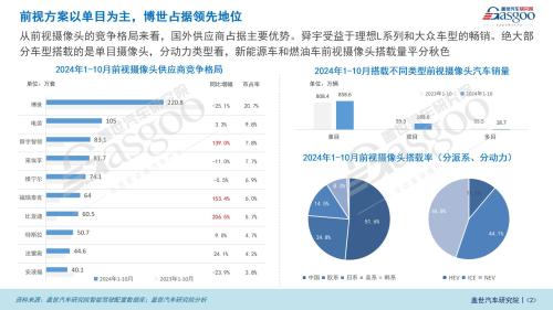 从摄像头类型来看,绝大部分车型搭载的是单目摄像头。分动力类型来看,新能源车和燃油车前视摄像头的搭载量基本平分秋色。这一趋势从前视摄像头在不同类型汽车上的销量数据可以得到印证。数据显示,2024年1-10月,单目摄像头在市场上的销量占主导地位,而双目和多目摄像头的应用相对较少。