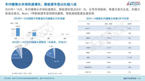 车内摄像头市场新能源车型2024年1-10月占比高达81.3%,主导了市场格局。单摄方案依旧为主流,多摄方案也逐渐普及,多款新能源车型如Model Y等在销量上领跑市场,智能座舱配置加速渗透。